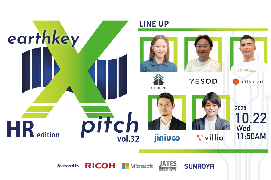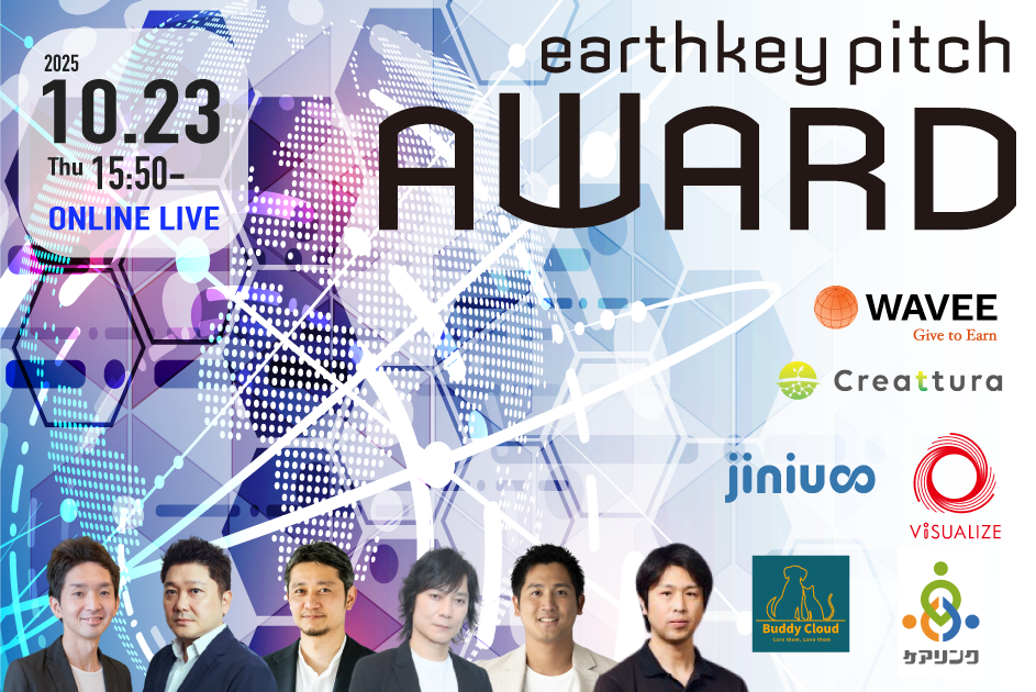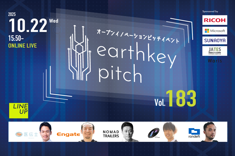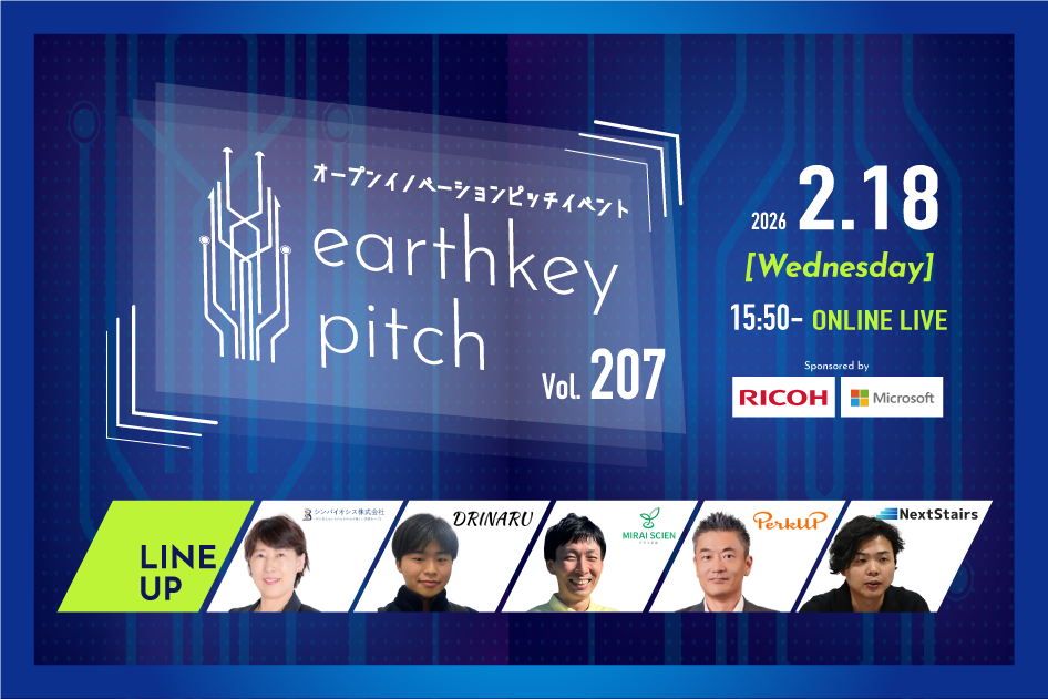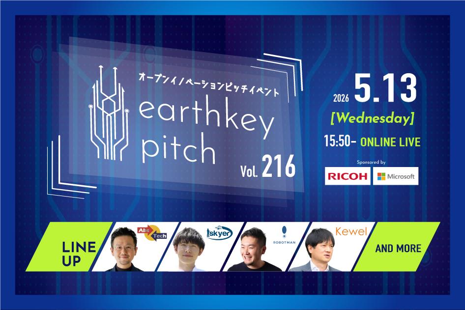 earthkey pitch(アースキー ピッチ) は、最先端テクノロジーを駆使したシード・アーリーステージの魅力的なスタートアップ企業5社が、事業PRや資金調達を目的にプレゼンテーションを行うピッチイベントです。